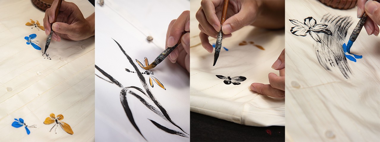 手绘工艺一直都是夏姿手工坊最具代表性的中式工艺之一,在多季时装作品中都可以感受到夏姿陈工匠们精湛的手绘技艺,真实的笔触鲜活生动。此次夏姿陈特别甄选5幅在东西方文化中兼具美感与寓意的手绘图案,以形物语描绘意境之美,分别是“兰·蜓”、“蓝·韵”、“梅·落”、“蝶·舞”、“翩·然”。象征蜕变、自由与浪漫爱情的蝴蝶,为白衬衫注入灵动生机;代表优雅、敏捷与夏日气息的蜻蜓,勾勒出轻盈精致的时尚穿搭;优雅的兰花、胭脂色的梅瓣,在旋转坠落时隐约散发出扑鼻而来的暗香;以笔刷为真实写照的线条,用力度与写意,表达出东方水墨画的深邃意境。顾客可以选择自己喜欢的图案进行组合,由夏姿陈的手工匠人进行绘制,让每一笔、每一画都充满专属感,让穿着者成为自身风格的主宰。