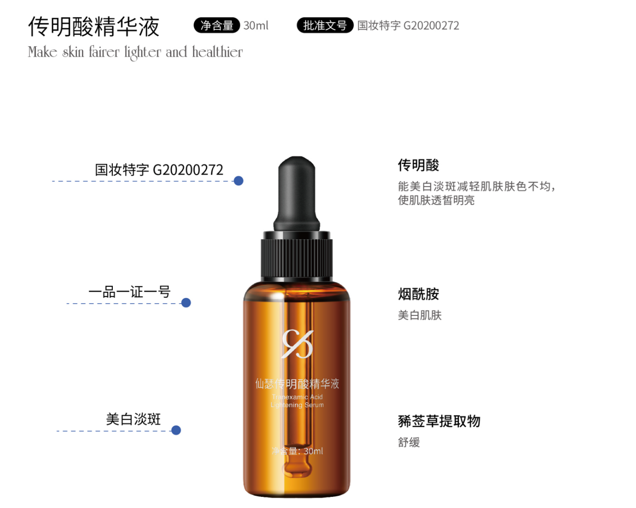 破解刺激难题,先从成分浓度的“精准把控”开始。仙瑟传明酸系列选择3%传明酸作为核心美白成分,这一浓度被业内视为“效能-刺激”的黄金平衡点。不同于高浓度传明酸可能引发的皮肤干燥、刺痛,3%浓度既能满足黑色素抑制的需求——通过阻断黑色素细胞信号传递,减少炎症后色沉的形成,又契合敏感肌对温和性的要求。《白皮书》中也提到,敏感肌适用的美白成分需兼顾“起效阈值”与“刺激阈值”,仙瑟3%传明酸的浓度设定,正是对这一需求的精准回应。