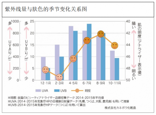 紫外线量从早春开始逐渐增加,其产生的影响据称大约在2个月后在肌肤上显现。以往年情况而言,8~9月份时的肤色,会因为夏季照射到的紫外线影响而变得非常暗沉。