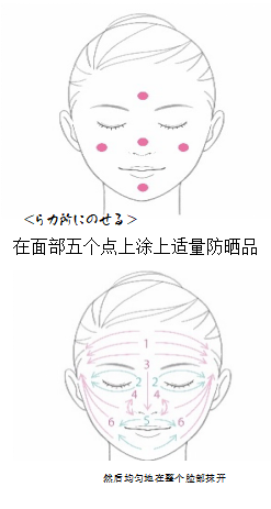 在涂抹时,首先取适量的防晒产品,涂在额头、两颊、鼻子和下巴部分。之后,两手均匀而全面地在整个面部抹开。对于眼、鼻、口周围的细部,要用指尖仔细地涂抹,并延伸至颈部,切莫忘记面部轮廓线、以及耳朵后面和后脖颈。自面部至颈部均匀涂抹,可以防止因日晒产生的肌肤色差。刚涂完防晒就立即戴上口罩和太阳镜的话,刚抹上的防晒可能立即就被破坏,所以最好稍候片刻,待防晒品完全与肌肤贴合。为了维持防紫外线效果,在擦汗等动作之后,也要时时记得补涂防晒产品。