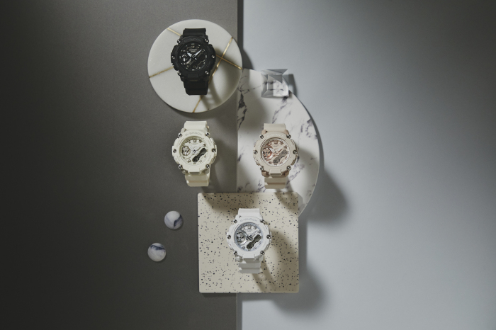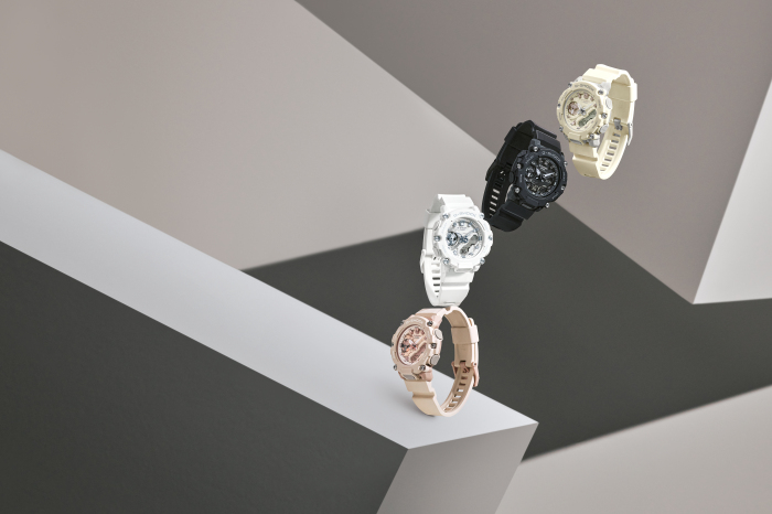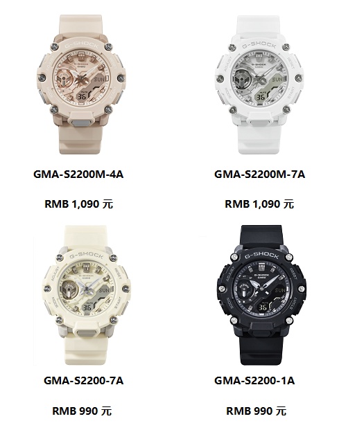 本次GMA-S2200系列在大自然与现代都市之间汲取灵感,从中提取低饱和度的色彩,带来四款配色方案。以高级的自然配色呈现全系列单品,满载Urban Outdoor气息。GMA-S2200M-4A以更为低调的粉色诠释户外型格的同时,也为硬核造型平添柔软生机;GMA-S2200M-7A则以白色调传递出中性风一贯的简练;GMA-S2200-7A融合了近年潮牌争相运用的复古奶油色,在低调的风格中增添了高街潮流元素;GMA-S2200-1A的黑色酷感十足,结合腕表硬朗线条瞬间A爆。配色友好,搭配起来也更游刃有余,为行走于都市和户外之间的G-SHOCK GIRLS轻松加分。